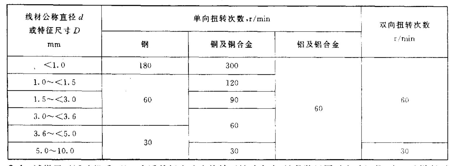3、除非另有规定,那么一般按照下表中所列有关材质的线材直径选用相应的扭转速度,其偏差应控制在规定转速的±10%以内。