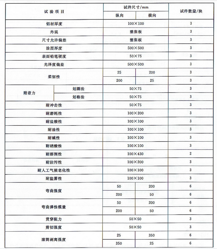 制取试样时,试件边部距离产品边部应该大于50mm,试样的尺寸及数量见下表。
