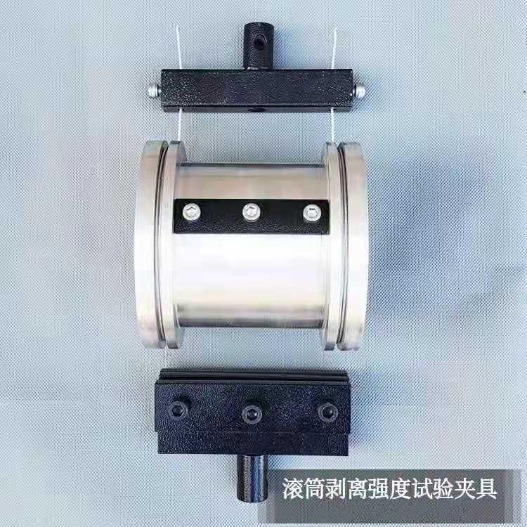 滚筒剥离强度夹具用于测试板夹层结构中面板与芯子间胶接的剥离强度的测定,也适用于选用胶黏剂的其他组合件的剥离强度测定。滚筒剥离强度一般是指夹层结构用滚筒剥离试验测得的面板与芯子分离时单位宽度上的抗剥离矩。具体为用带凸缘的筒体从夹层结构中剥离面板的方法来测定面板与芯子胶接的抗剥离强度。面板一头连接在筒体上,另一头连接上夹具,凸缘连接加载带,拉伸加载带时,筒体向上滚动,从而把面板从夹层结构中剥离开,凸缘上的加载带与筒体上的面板相差一定距离,夹层结构滚筒剥离强度实为面板与芯子分离的单位宽度上的抗剥离力矩。