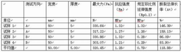 求取参数:最大力(Fm)、抗拉强度(Rm)、规定非比例延伸强度(Rp0.2)、断裂总伸长率(At)