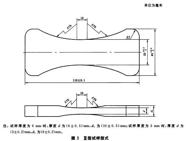 1.3 Ⅲ型试样只适用于测定模压短切纤维增强塑料的拉伸强度。其厚度为3mm和6mm 两种。仲裁试样的厚度为3mm。测定短切纤维增强塑料的其他拉伸性能可以采用工型或Ⅱ型试样。
