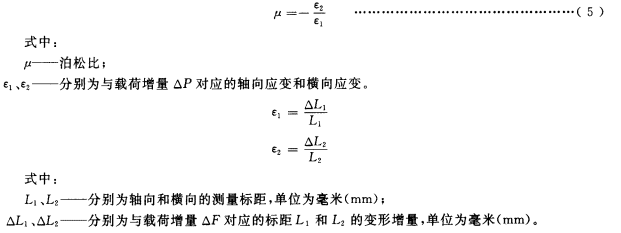 8、测定拉伸弹性模量、泊松比时,无自动记录装置可采用分级加载,级差为破坏载荷的5%~10%,至少分五级加载,施加载荷不宜超过破坏载荷的50%。一般至少重复测定三次,取其两次稳定的变形增量,记录各级载荷和相应的变形值。