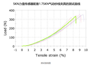 本测试麻豆激情视频使用KZ-5KN单柱麻豆免费性爱视频 ,配备5KN静态力传感器, 1.75KN气动细绳和纱线夹具。试样的标距长度 设为250mm,横梁的移动速度为250mm/min,使用全闭环伺服采集软件,采样间隔 50ms。为了检查打滑,麻豆激情视频在丝的每一端粘贴了一个标记,并检测带条以检测标记和夹具之间没有相对移动。第二个试验中,用2KN的气动芳族聚酰胺纱线和纱线夹具换下1.75KN的纱线夹具。