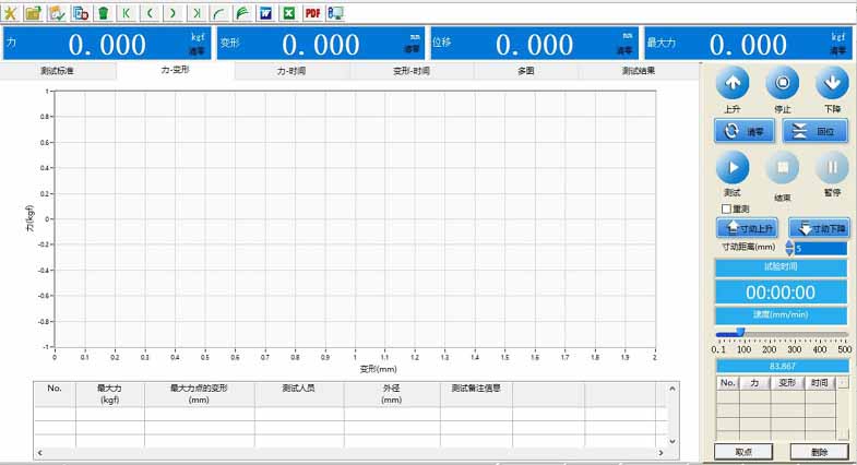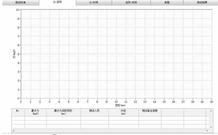 (2).曲线显示界面:用来显示测试得到的各种曲线,比如力-变形,力-时间,变形-时间等各种曲线,也可对曲线做放大缩小等操作,力量-位移等曲线显示: