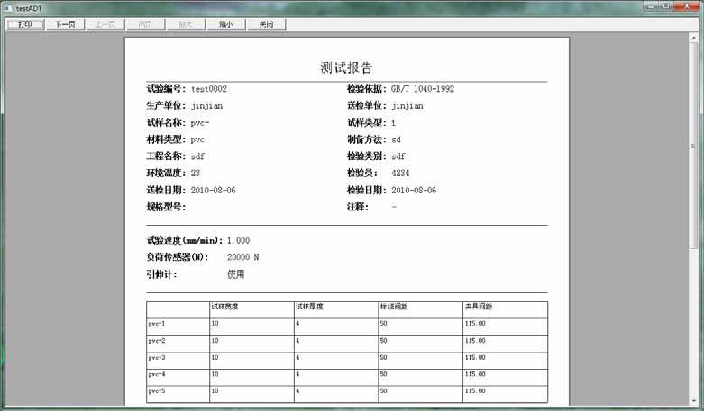 点击“试验报告”按钮,进入试验报告界面如图所示,可以查看试验报告,设置打印选项等;