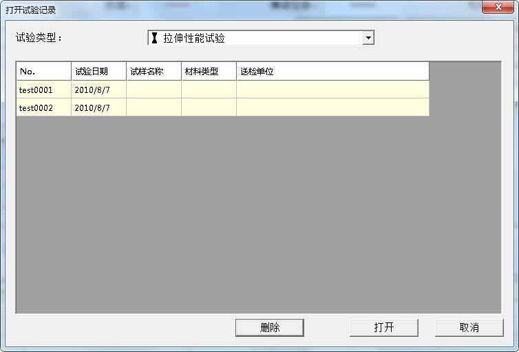 单击工具条上的“打开记录”按钮,或选择“文件”菜单的“打开记录”菜单项,调出打开对话框;选择拉伸试验类型,在列表选择试验记录,然后单击“打开”按钮,或双击该条目,打开该试验记录。