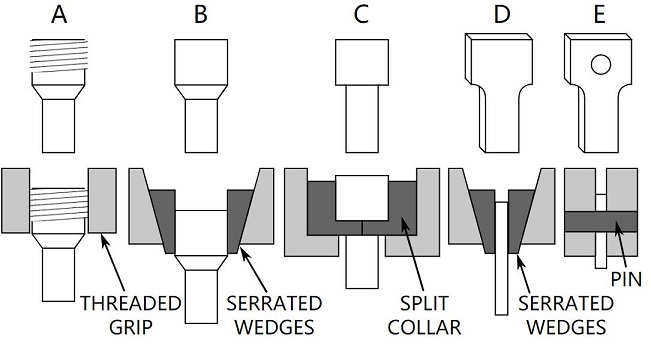 A至C为圆型肩部试件;D 和 E 为平肩部试件A. 圆型肩部使用螺纹固定