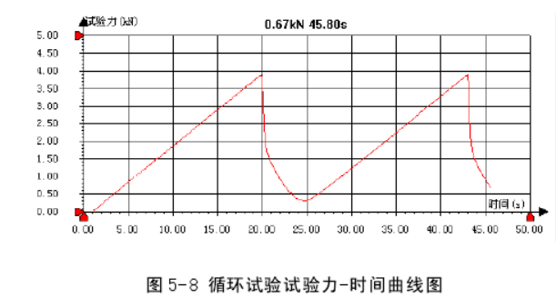 耐受试验也是材料试验中十分常见的一种试验方式,其用于测试材料的抗疲劳特性,此试验进行的试验时间比较长。该试验方式下,用户设定的试验参数包括加载速度(KN/S)、加载负荷(KN)、保压时间(h)、数据记录时间(Min)。用户配置参数的含义为将材料按照设定的加载速度进行加载,加载到设定的加载负荷后,保持此加载负荷设定的保压时间。保压时间到后,此耐受试验结束。如果在保压时间没到情况下,材料被拉断,则说明材料耐受特性不合格。考虑到耐受试验进行时间比较长(一般以小时计),此处包含数据记录时间,该参数以分钟为单位,表示每隔该设定的时间便更新记录当前试验情况,以防意外因素(比如说停电)中止该试验后,下次可以调取记录,在此试验的基础上继续进行试验。