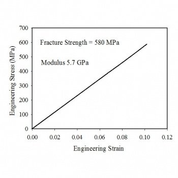 工程应变从零增加到约0.10。工程应力从零线性增加到大约580 MPa,即断裂强度。模量为5.7GPa。