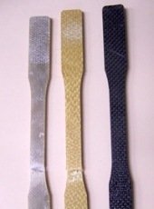 测试材料为玻璃纤维,杜邦材料和碳纤维复合材料。这三种复合材料,复合材料是两种或多种单独材料的组合,目的是生产具有任何一种单一材料都没有的独特性能的材料。所有这些复合材料均使用环氧树脂作为基质,从而像各种材料的纤维排列一样“粘合”织物。环氧树脂是热固性网络聚合物,虽然非常坚硬,但很脆,但很脆弱。具有不同外观的材料的三个狭窄部分。