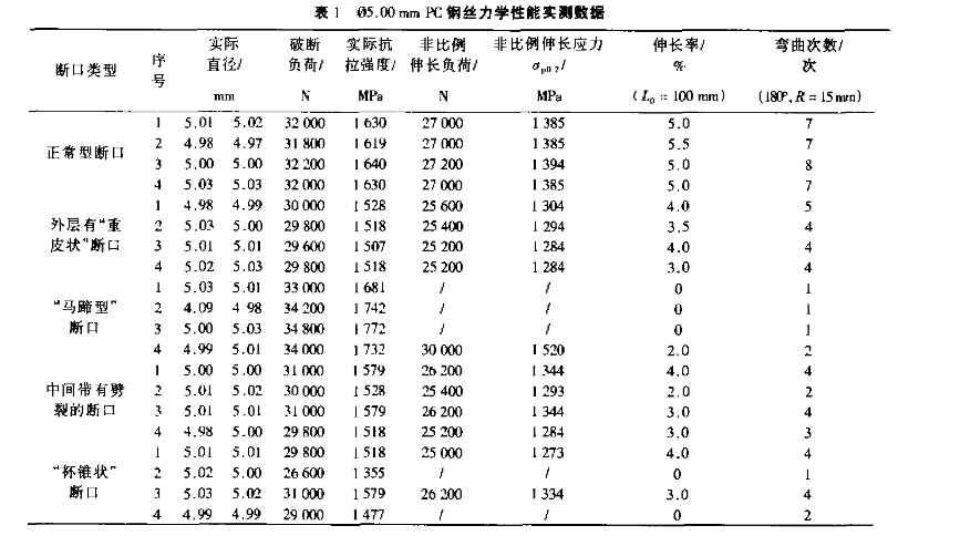 每一种断口累出了四种数据,见下图。根据GB/T5223-1995标准,φ5.0mm的1570MPa级消除应力钢丝的力学性能为: