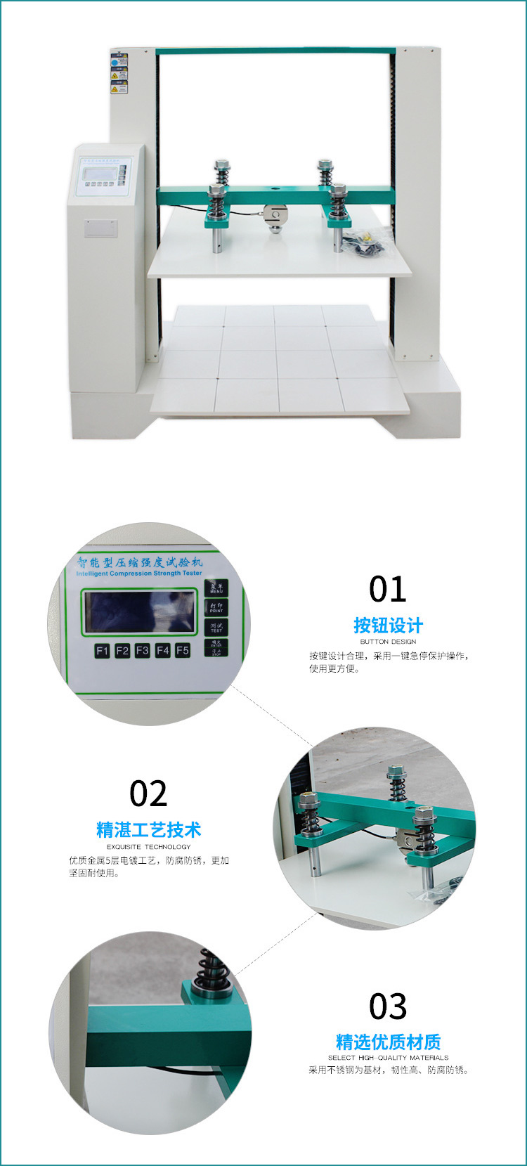 3.可输入相关数据并自动换算抗压强度,自带包装堆码测试功能,可直接设定力量、时间,测试完成后自动停机;